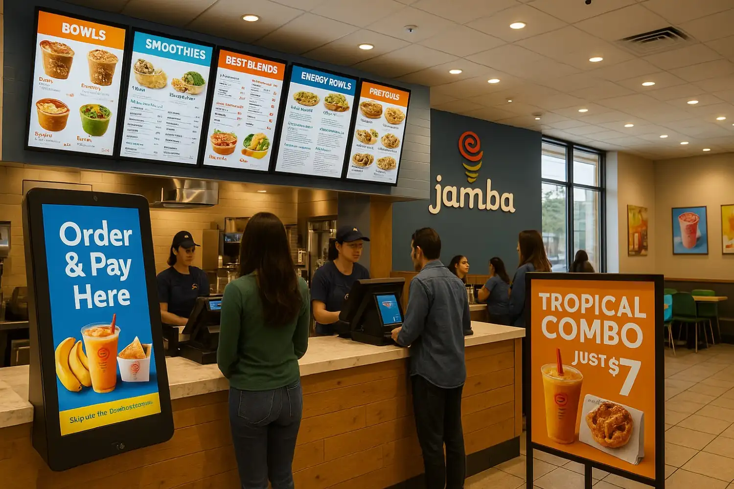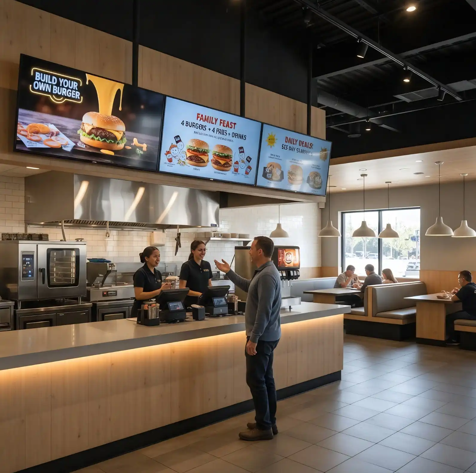 Dynamic digital menu boards highlight upsells, speed service, and improve order accuracy. Promotions update instantly, reducing print costs and increasing ticket size.